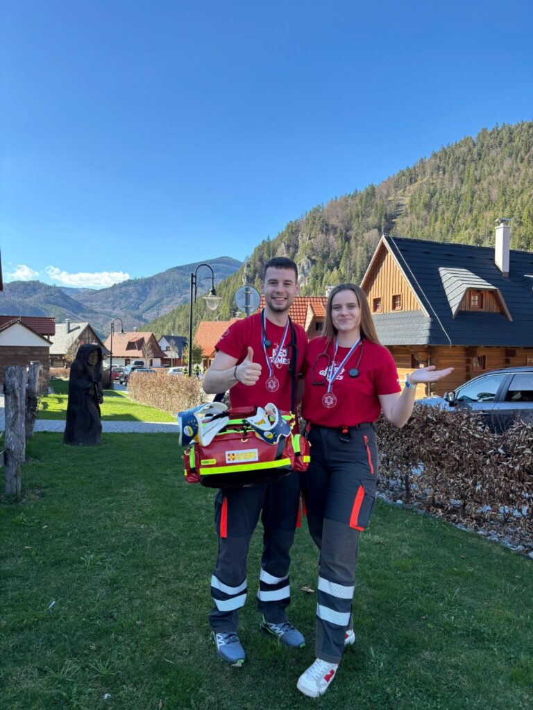 Aj keď Laura a Tony oficiálne reprezentovali svoje školy, pozornému oku na fotografiách neunikol jeden „malý“ detail. Obaja totiž na súťažných stanovištiach behali v našich samaritánskych nohaviciach a mali v rukách profesionálnu zdravotnícku tašku ASSR.